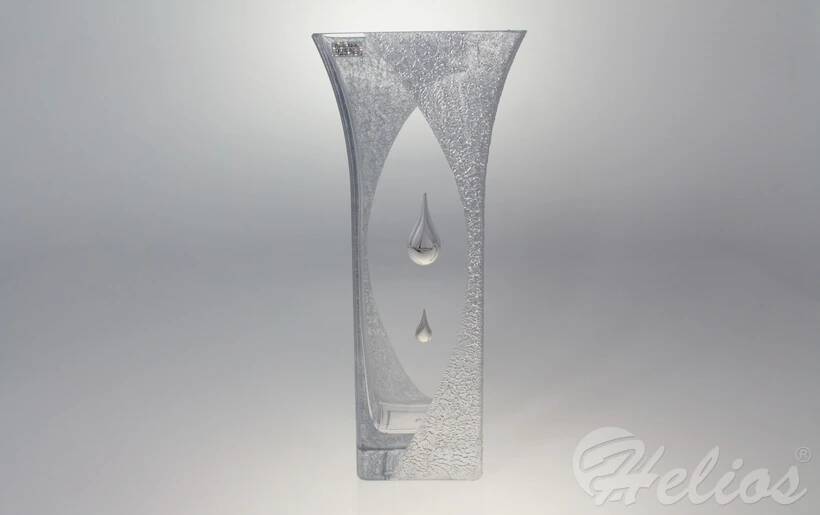 Elegancki wazon z boku ozdobiony srebrem, przypominającym pognieciony srebrny papier naklejony na szkle oraz srebrnymi błyszczącymi kroplami.