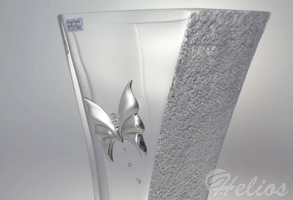 Wazon zdobiony srebrnym motylem i kryształkami.